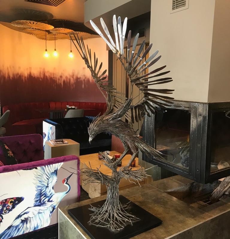 Dekoratif Kartal Heykeli tamamen atıl metallerden üretilmiştir. Kanatları ise sergilendiği işyerine itafen mutfak eşyası olarak kullanılan bıçaklar ile yapılmıştır. Hertürlü hayvan figürü, istnilen malzemeler ile heykel olarak üretilebilmektedir.